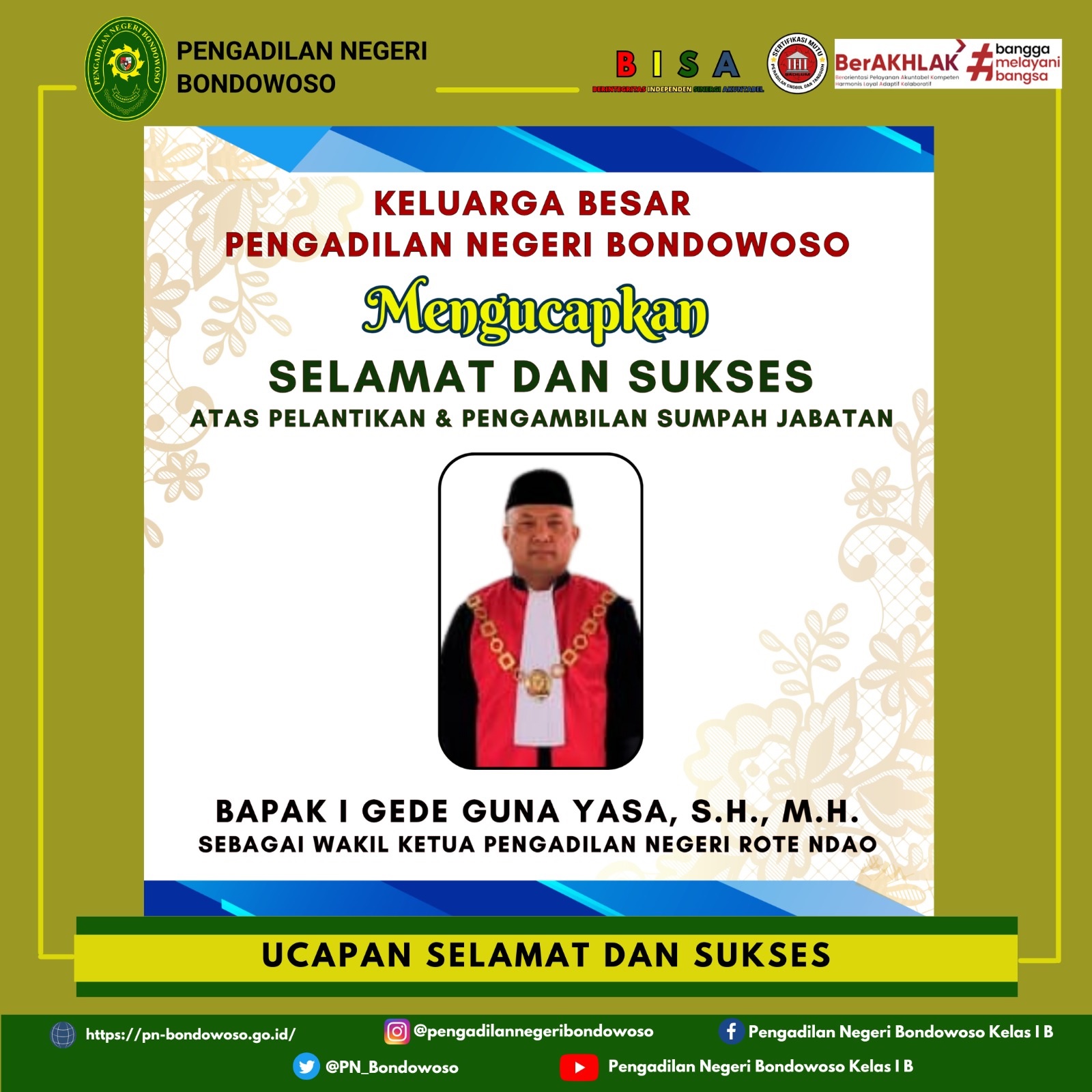 Keluarga Besar Pengadilan Negeri Bondowoso mengucapkan Selamat dan Sukses Atas Pelantikan dan Pengambilan Sumpah Jabatan Bapak I Gede Susila Guna Yasa, S.H., M.H. Sebagai Wakil Ketua Pengadilan Negeri Rote Ndao