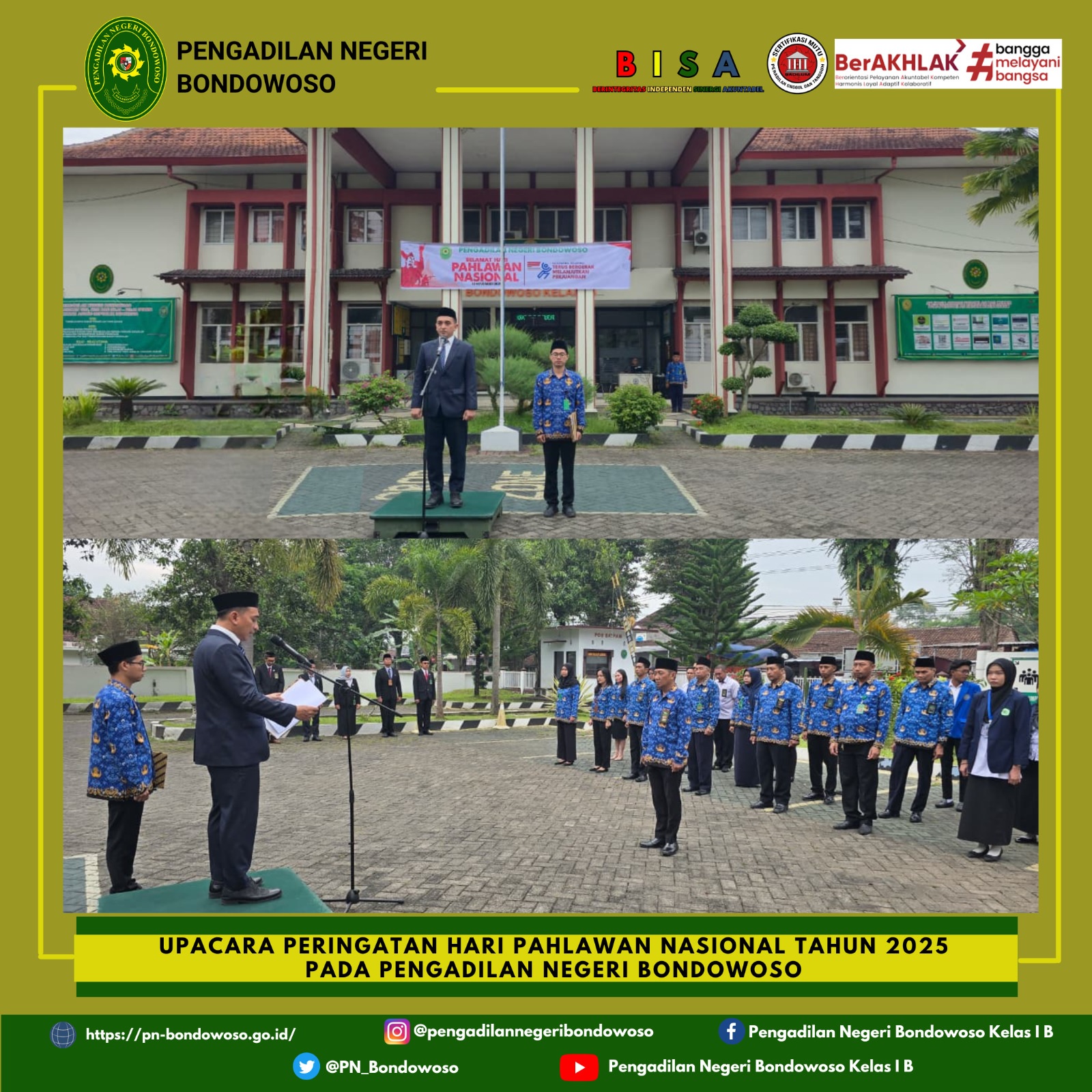 Pengadilan Negeri Bondowoso melaksanakan Upacara Peringatan Hari Pahlawan pada 10 November 2025. Bertempat di halaman utama Pengadilan Negeri Bondowoso, Upacara Peringatan Hari Pahlawan berlangsung khidmat dengan diikuti oleh para Hakim, pegawai dan siswa serta Mahasiswa Praktik Kerja Lapangan pada Pengadilan Negeri Bondowoso.