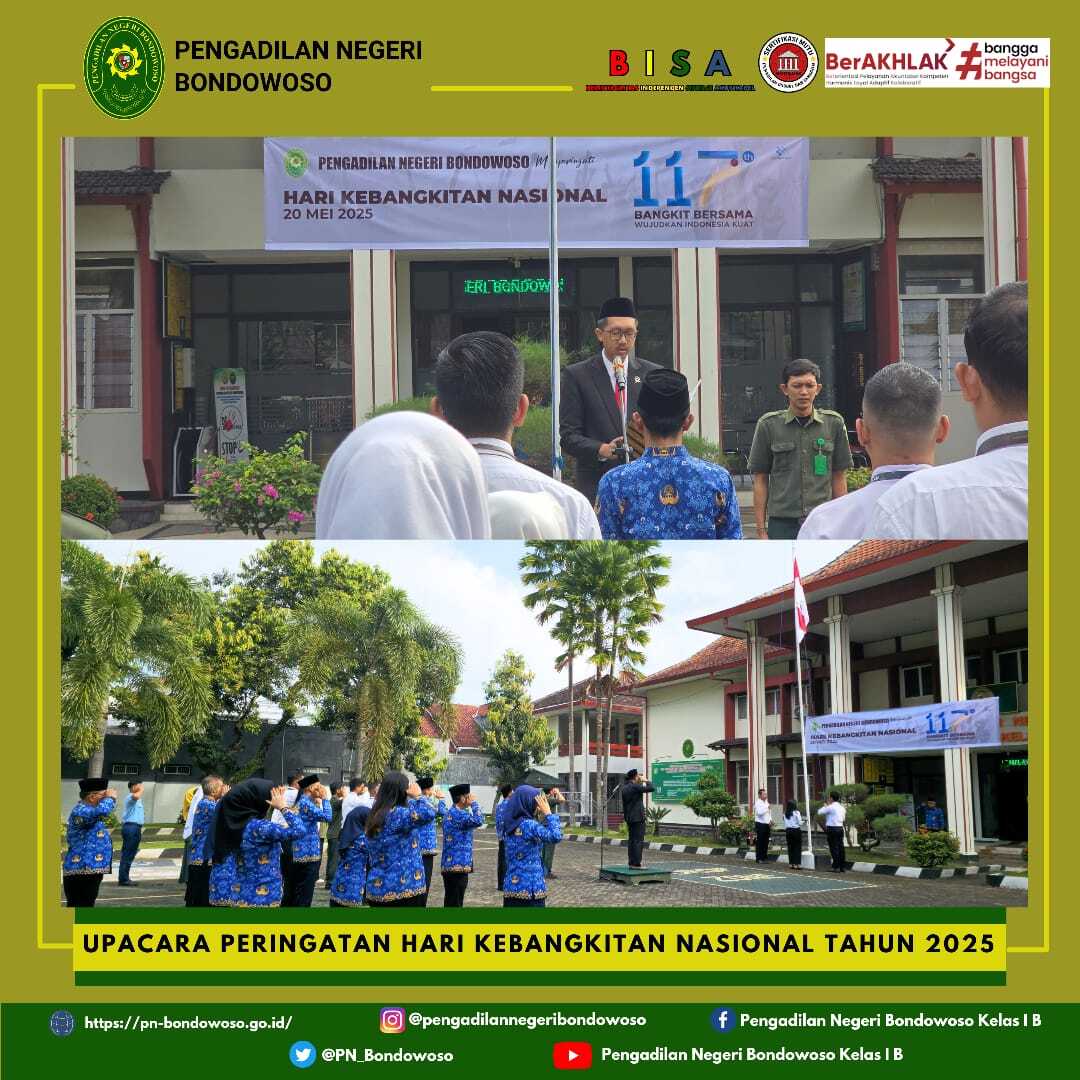 Pengadilan Negeri Bondowoso melaksanakan Upacara Peringatan Hari Kebangkitan Nasional Tahun 2025 di Halaman Pengadilan Negeri Bondowoso. Kegiatan tersebut berlangsung dengan khidmat diikuti oleh pegawai Pengadilan Negeri Bondowoso.