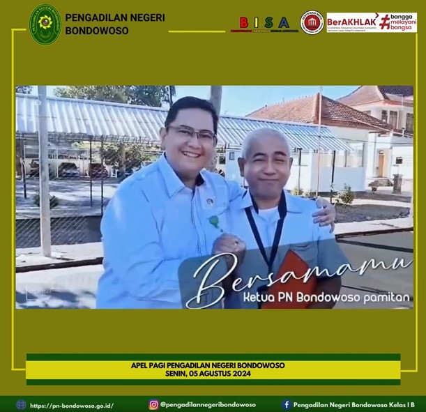 Dalam kesempatan itu juga Ketua Pengadilan Negeri Bondowoso berpamitan kepada seluruh personil Pengadilan Negeri Bondowoso karena akan melaksanakan dinas di tempat tugas yang baru.