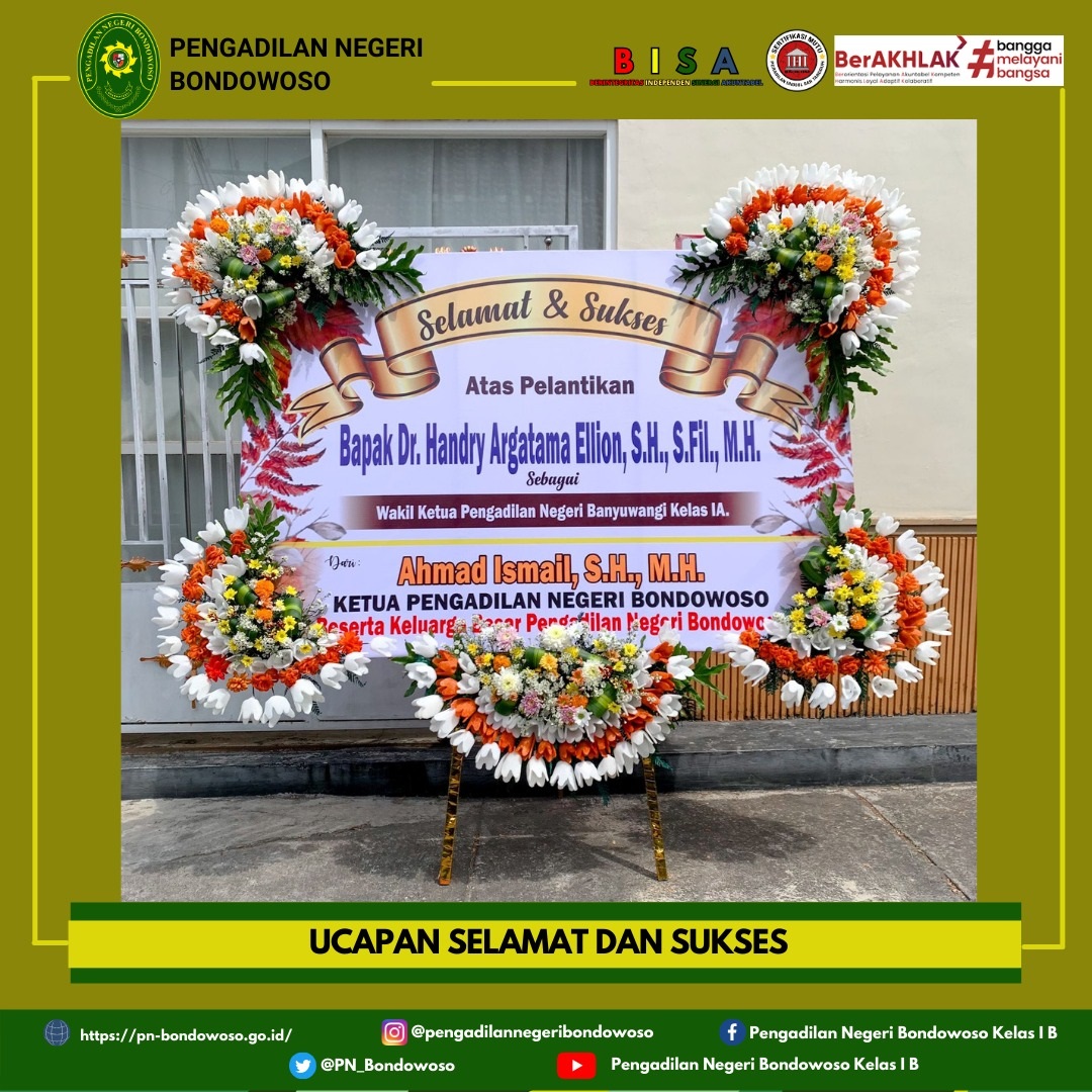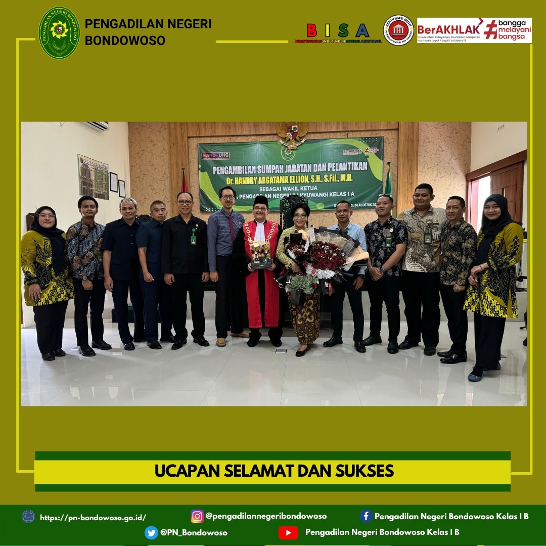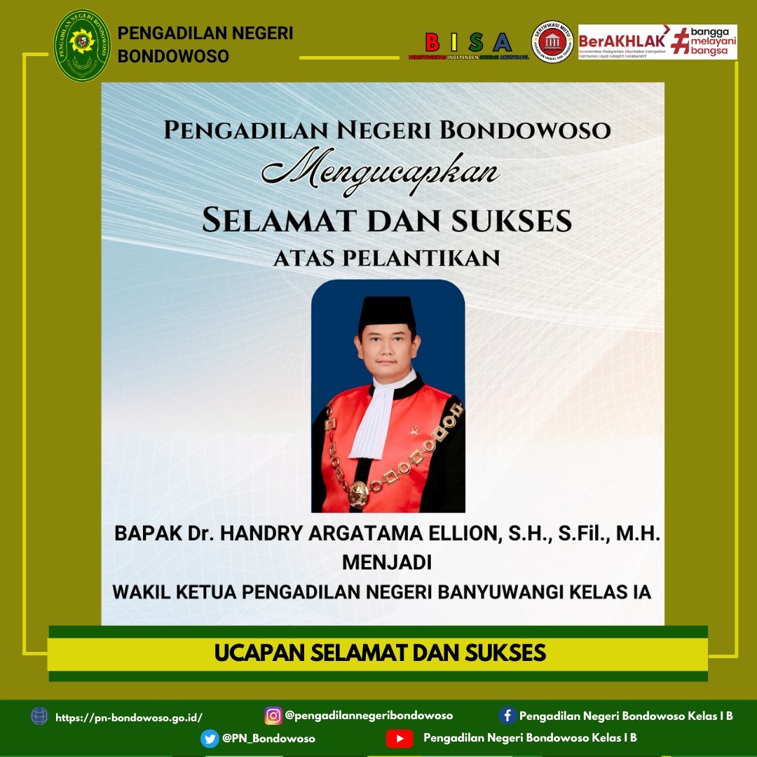 Pengadilan Negeri Bondowoso mengucapkan selamat dan sukses atas Pelantikan Bapak Dr. Handry Argatama Ellion, S.H., S.Fil., M.H. sebagai Wakil Ketua Pengadilan Negeri Banyuwangi Kelas IA.