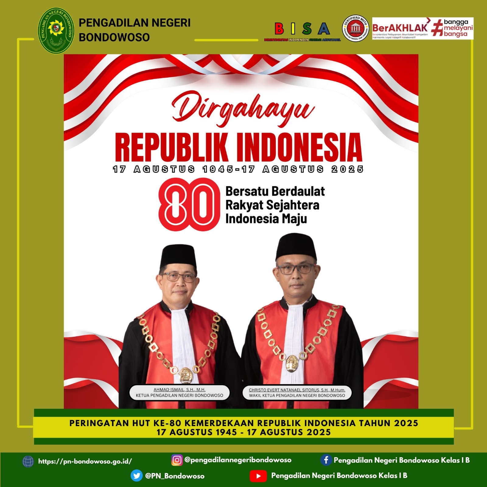 Pengadilan Negeri Bondowoso mengucapkan selamat Hari Kemerdekaan Republik Indonesia Ke-80.
