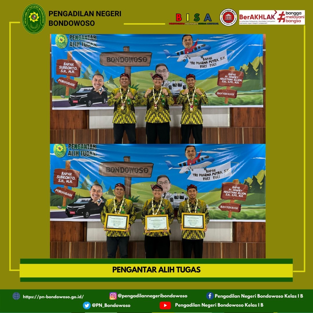 Pengantar Alih Tugas Bapak Dr. Handry Argatama Ellion, S.H., S.Fil., M.H. dari Ketua Pengadilan Negeri Bondowoso menjadi Wakil Ketua Pengadilan Negeri Banyuwangi, Bapak Subronto, S.H., M.H. dari Wakil Ketua Pengadilan Negeri Bondowoso menjadi Ketua Pengadilan Negeri Purwodadi, dan Bapak Tri Dharma Putra, S.H. dari Hakim Pengadilan Negeri Bondowoso menjadi Wakil Ketua Pengadilan Negeri Toli-Toli.
