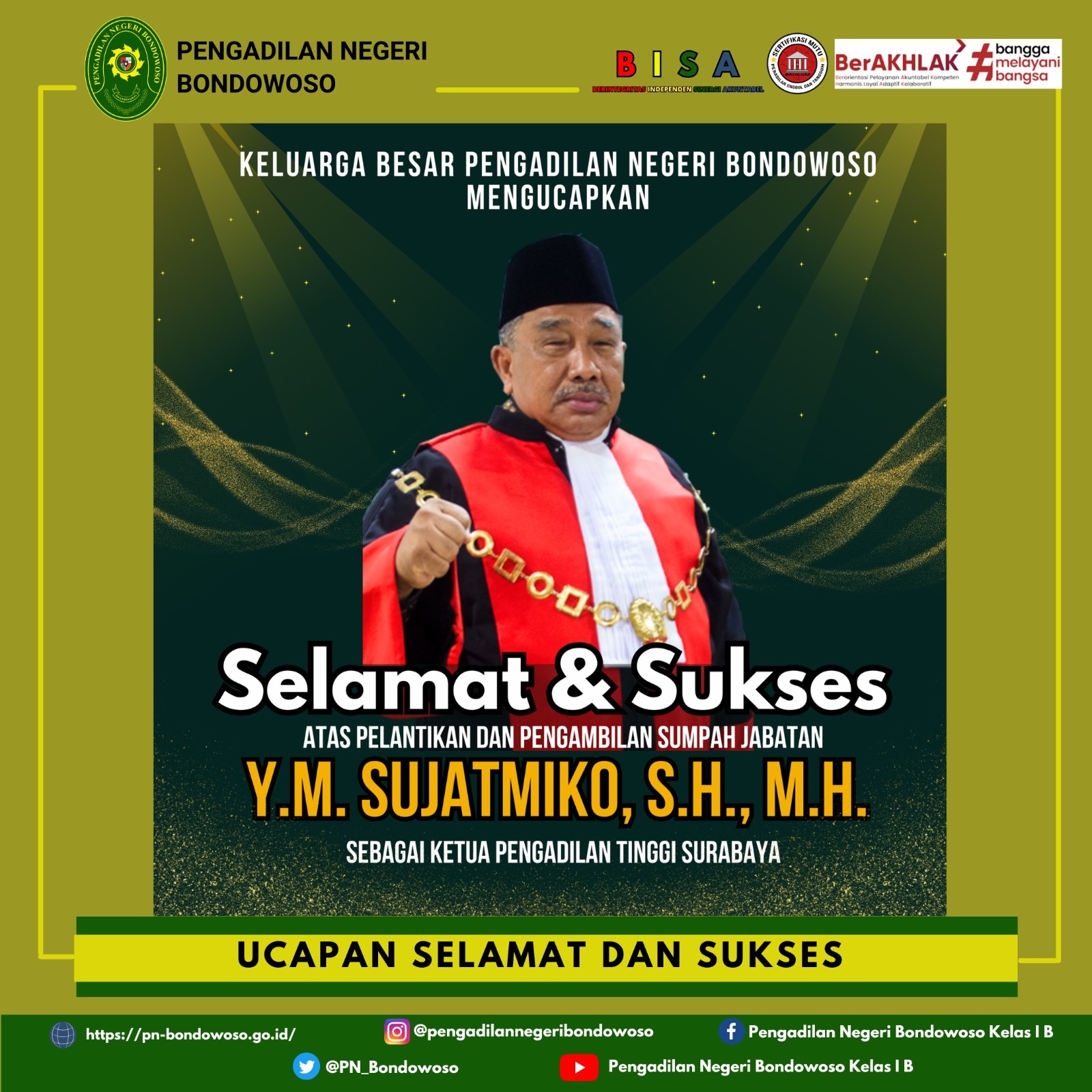 Keluarga Besar Pengadilan Negeri Bondowoso mengucapkan Selamat dan Sukses Atas Pelantikan dan Pengambilan Sumpah Jabatan Y.M. Sujatmiko, S.H., M.H. Sebagai Ketua Pengadilan Tinggi Surabaya