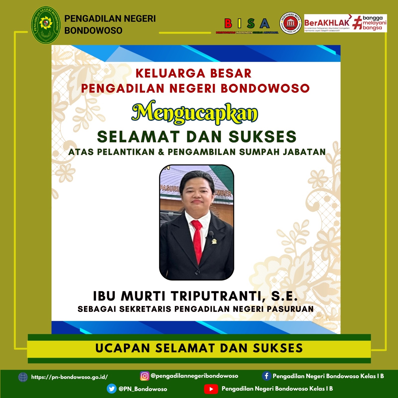 Keluarga Besar Pengadilan Negeri Bondowoso mengucapkan Selamat dan Sukses Atas dilantiknya Ibu Murti Triputranti, SE. sebagai Sekretaris Pengadilan Negeri Pasuruan.