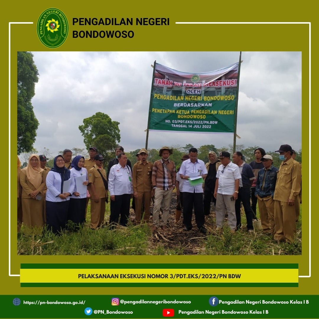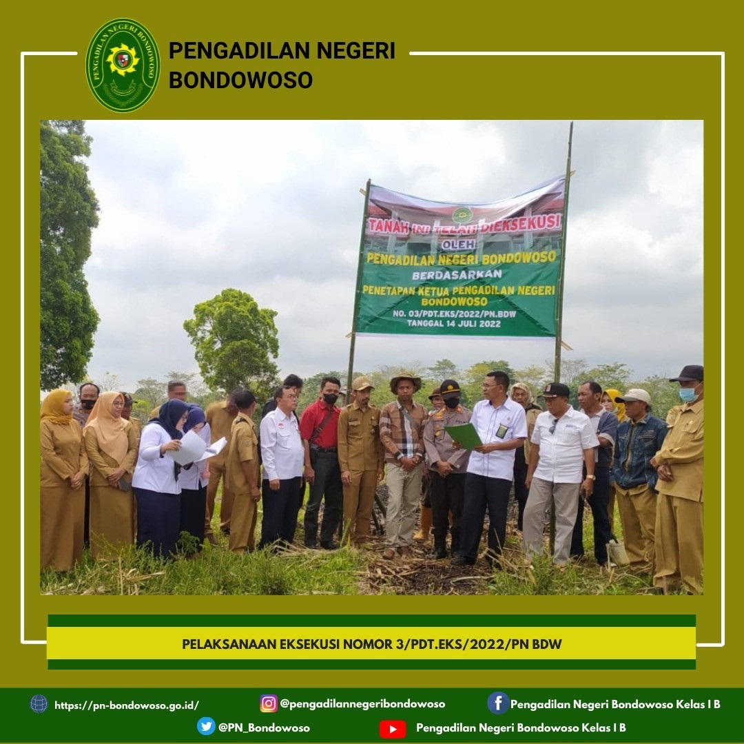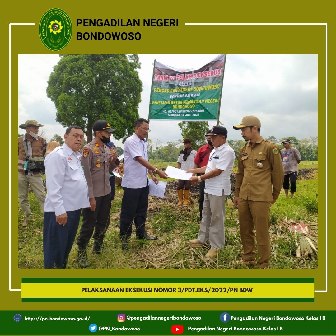 Pengadilan Negeri Bondowoso melaksanakan eksekusi nomor 3/Pdt.Eks/2022/PN Bdw yang dilaksanakan di Desa Gunosari, Kecamatan Tlogosari, Kabupaten Bondowoso. Eksekusi tersebut berjalan dengan lancar berkat kooperatifan para pihak, pihak kepolisian, dan pihak desa Gunosari.