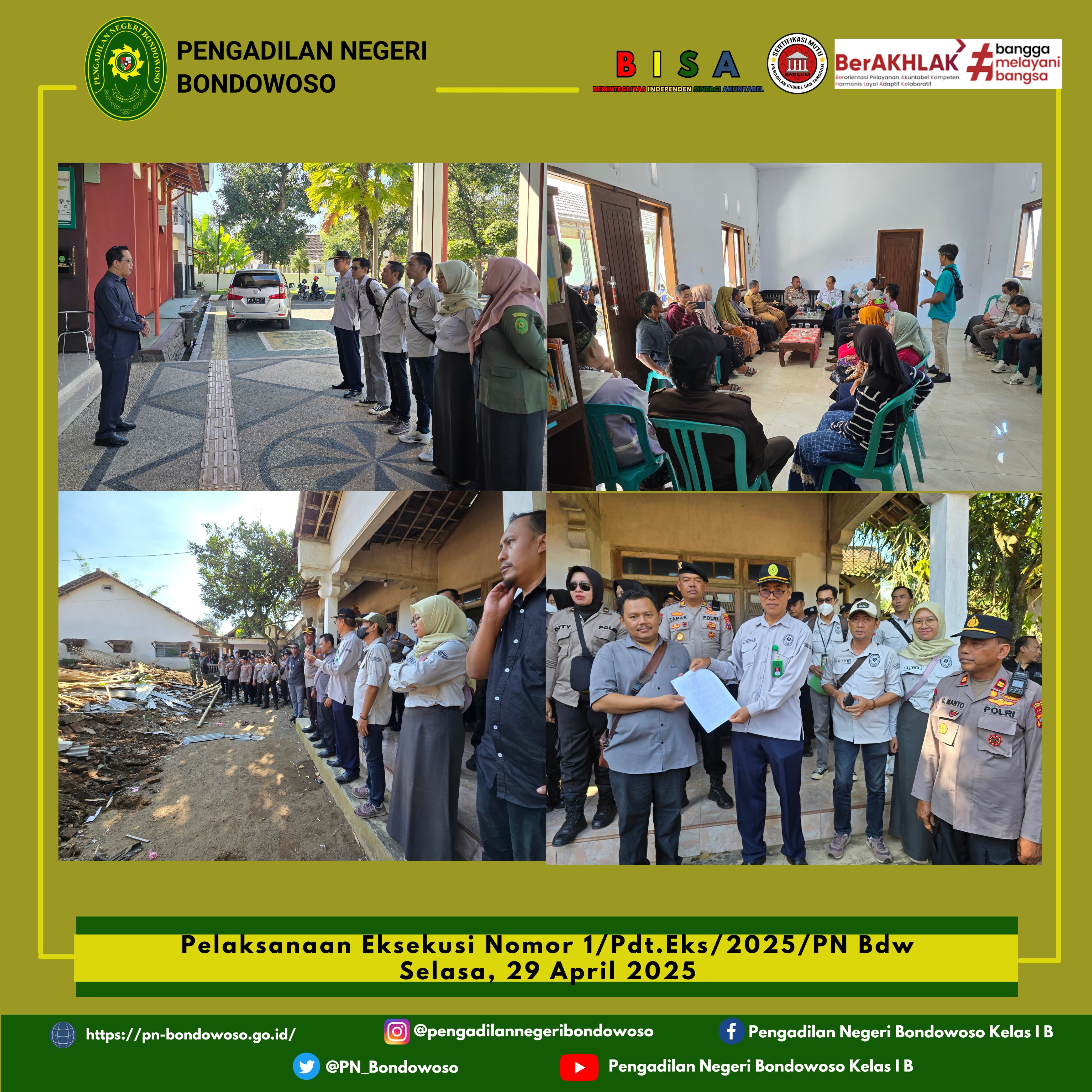 Pengadilan Negeri Bondowoso melaksanakan Eksekusi dengan nomor register 1/Pdt.Eks/2025/PN Bdw yang bertempat di wilayah Desa Jambesari yang diajukan oleh Para Pemohon Eksekusi melalui Kuasanya. Pelaksanaan eksekusi diawali dengan pembacaan Penetapan Eksekusi dihadapan Para Pihak. Setelahnya, Tim dari Pengadilan Negeri Bondowoso menuju lokasi obyek eksekusi.