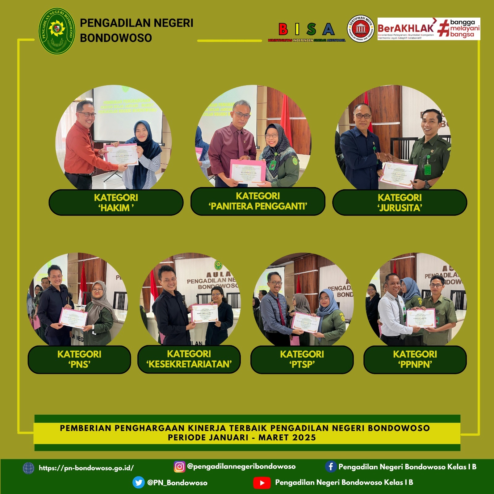 Pemberian Piagam Penghargaan Kinerja Terbaik PN Bondowoso Periode Januari - Maret 2025 diberikan kepada pegawai PN Bondowoso dengan kinerja terbaik selama bulan Januari - Maret 2025. Berikut rincian penerima Piagam Penghargaan Kinerja Terbaik PN Bondowoso Periode Januari - Maret 2025 :